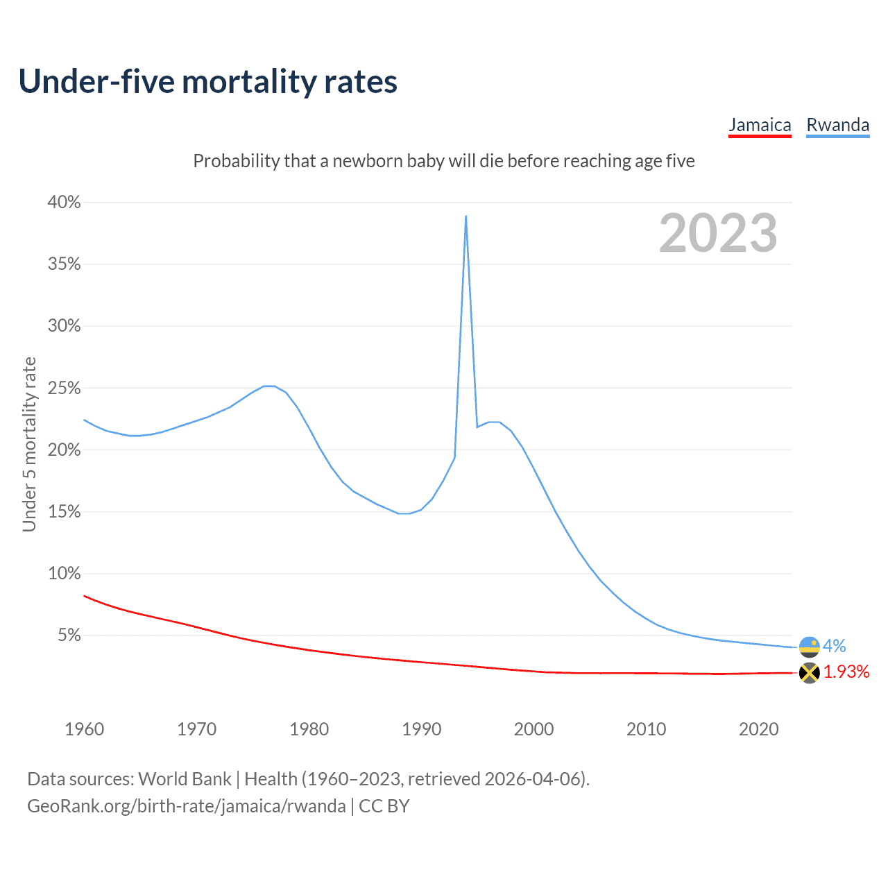 The chance that a newborn baby will die before reaching age five is 1.93% in Jamaica and 4% in Rwanda. Above is a chart with historical data on under-five mortality rates.