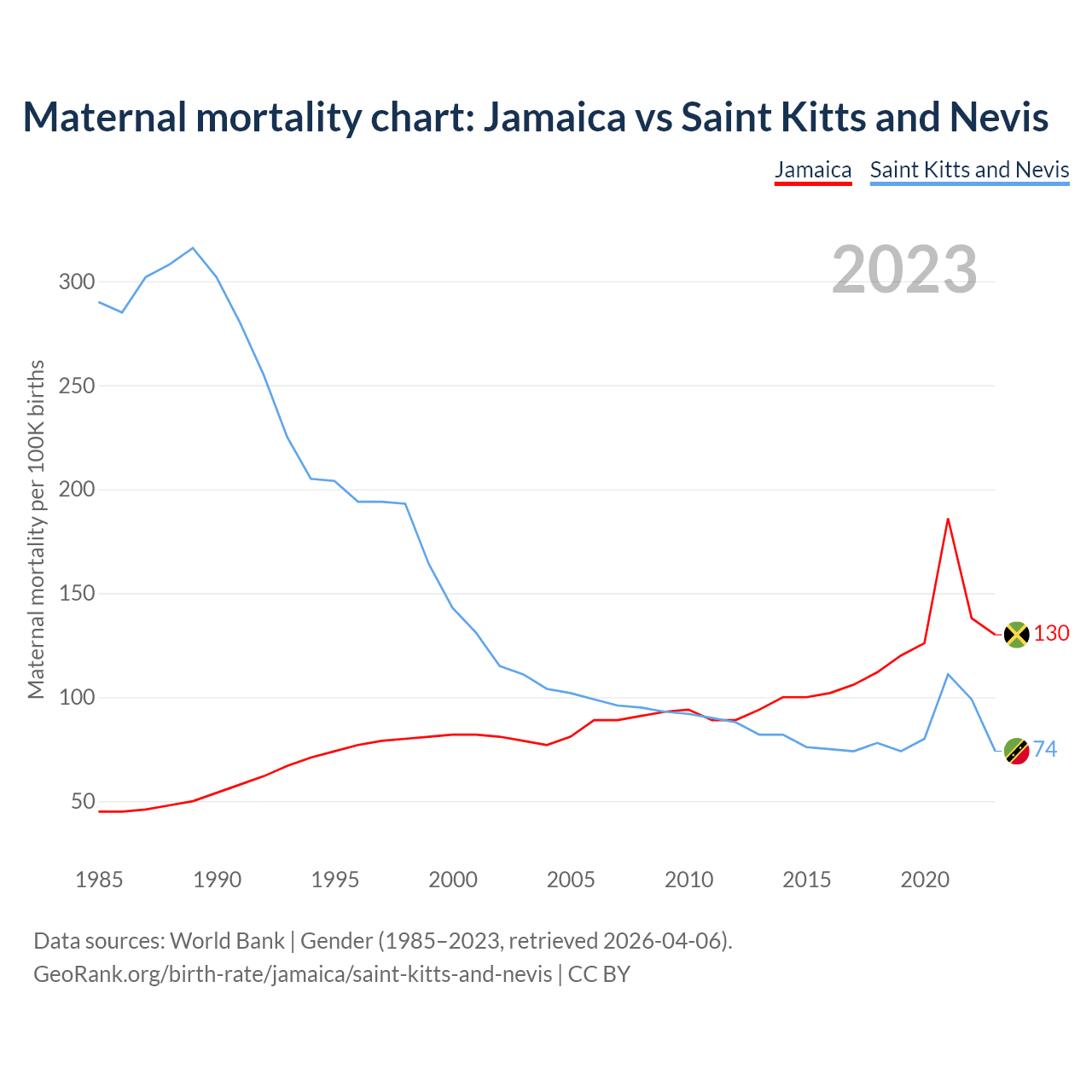 The maternal mortality rate, which is the probability of dying during childbirth or within 42 days of pregnancy termination, is 130 deaths per 100,000 live births in Jamaica, compared to 74 deaths in Saint Kitts and Nevis.
