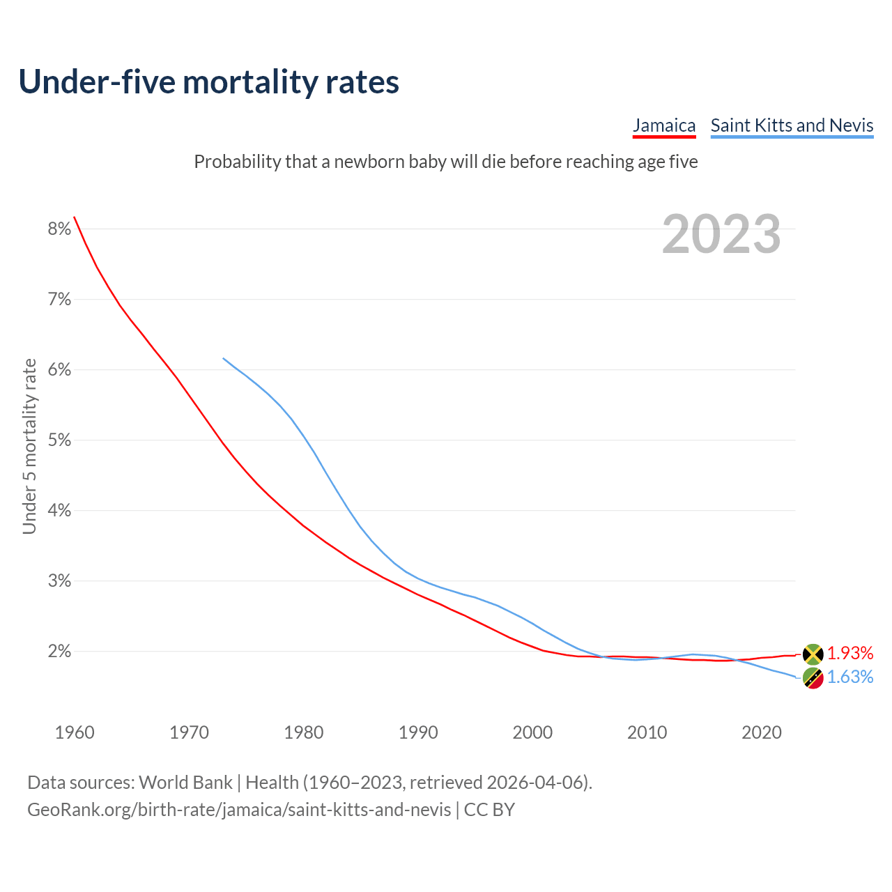 The chance that a newborn baby will die before reaching age five is 1.93% in Jamaica and 1.63% in Saint Kitts and Nevis. Above is a chart with historical data on under-five mortality rates.