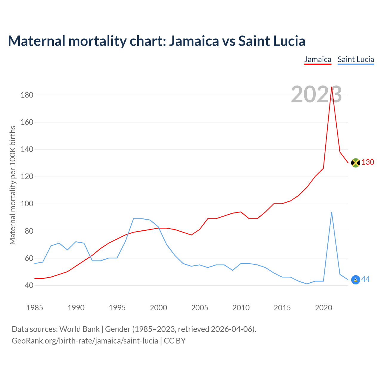 The maternal mortality rate, which is the probability of dying during childbirth or within 42 days of pregnancy termination, is 130 deaths per 100,000 live births in Jamaica, compared to 44 deaths in Saint Lucia.