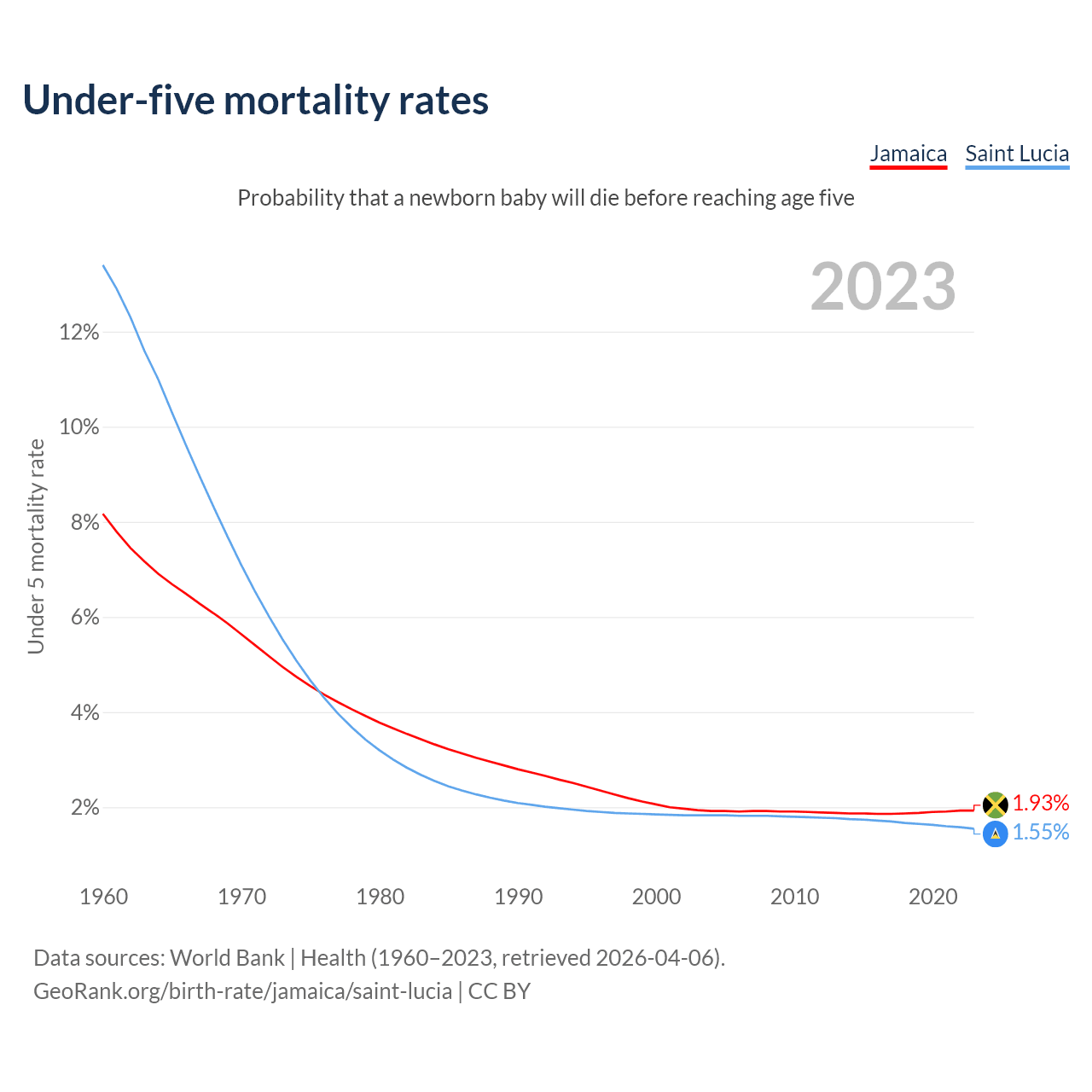 The chance that a newborn baby will die before reaching age five is 1.93% in Jamaica and 1.55% in Saint Lucia. Above is a chart with historical data on under-five mortality rates.