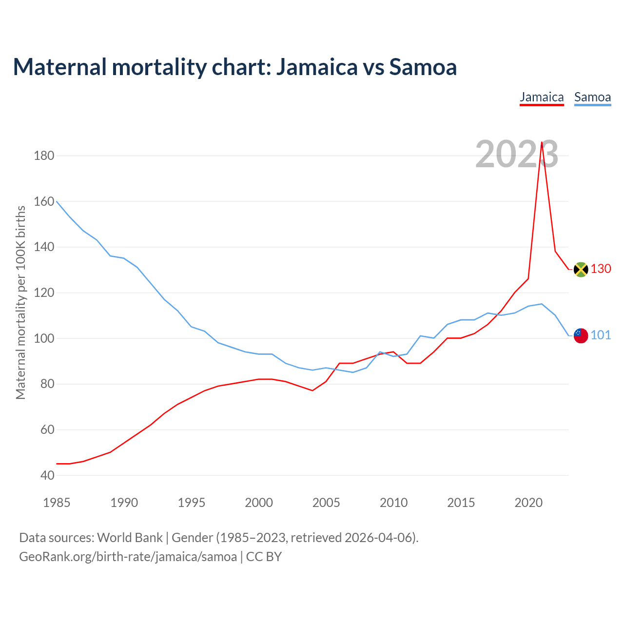 The maternal mortality rate, which is the probability of dying during childbirth or within 42 days of pregnancy termination, is 130 deaths per 100,000 live births in Jamaica, compared to 101 deaths in Samoa.