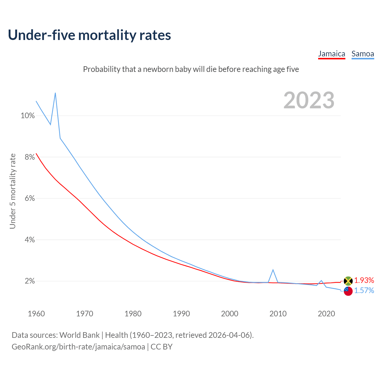 The chance that a newborn baby will die before reaching age five is 1.93% in Jamaica and 1.57% in Samoa. Above is a chart with historical data on under-five mortality rates.