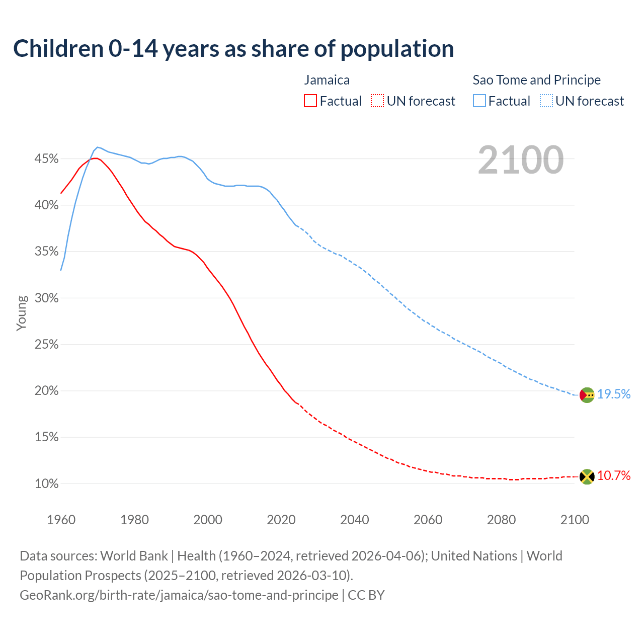 Jamaica has an annual birth rate of 11.6 births per 1,000 people, compared to 28.2 for Sao Tome and Principe. The average number of children a woman is expected to have during her lifetime — the fertility rate, is 1.36 in Jamaica and 3.64 in Sao Tome and Principe — 168.3% difference.
