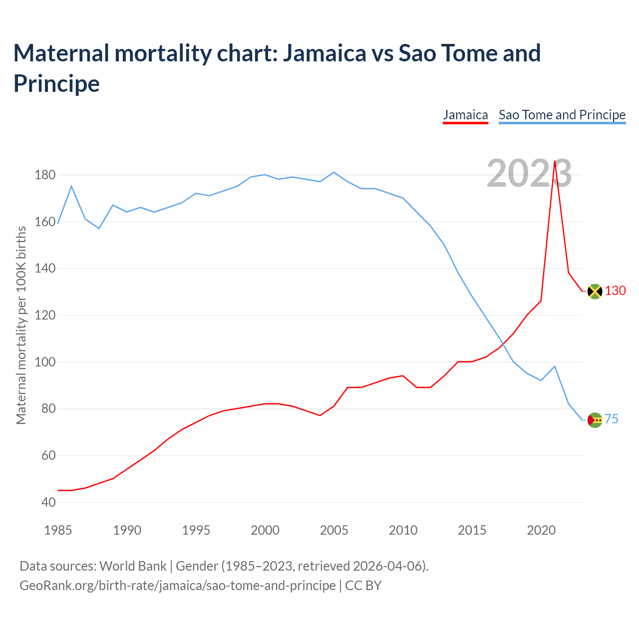 The maternal mortality rate, which is the probability of dying during childbirth or within 42 days of pregnancy termination, is 130 deaths per 100,000 live births in Jamaica, compared to 75 deaths in Sao Tome and Principe.
