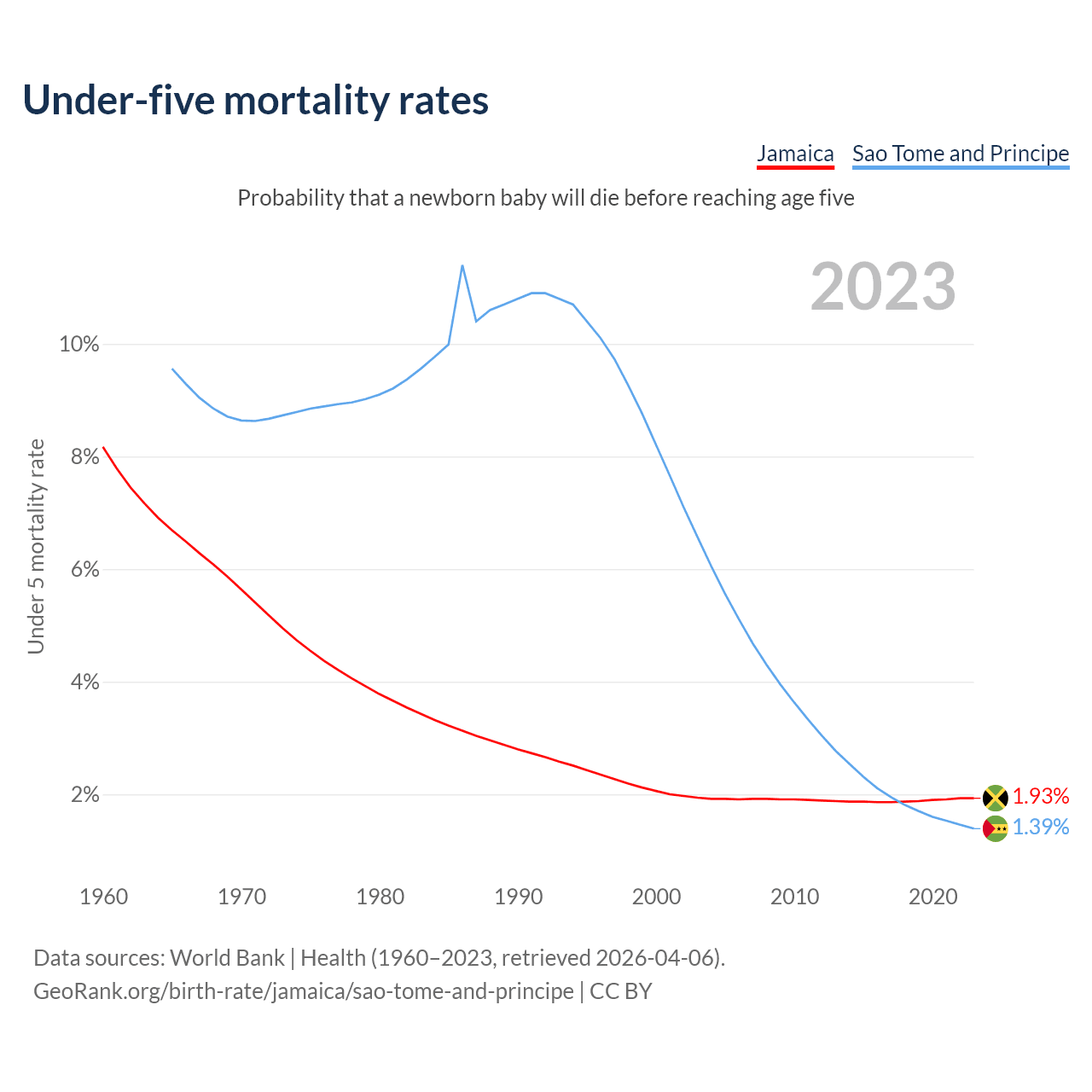 The chance that a newborn baby will die before reaching age five is 1.93% in Jamaica and 1.39% in Sao Tome and Principe. Above is a chart with historical data on under-five mortality rates.
