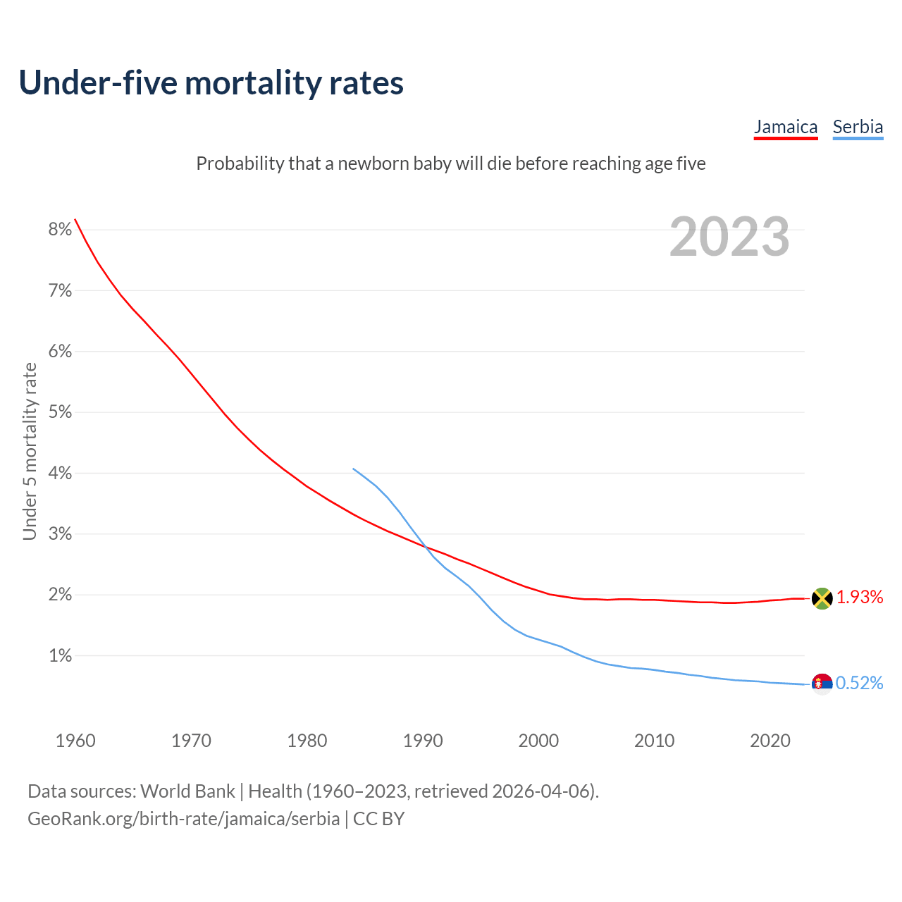 The chance that a newborn baby will die before reaching age five is 1.93% in Jamaica and 0.52% in Serbia. Above is a chart with historical data on under-five mortality rates.