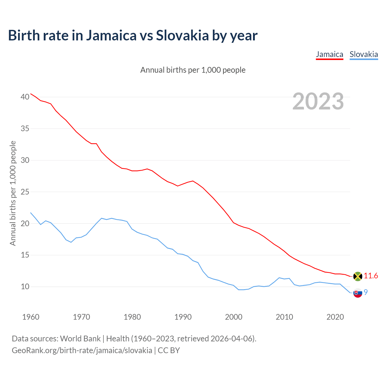 Jamaica has an annual birth rate of 11.6 births per 1,000 people, compared to 9 for Slovakia. The average number of children a woman is expected to have during her lifetime — the fertility rate, is 1.36 in Jamaica and 1.49 in Slovakia — 9.72% difference.