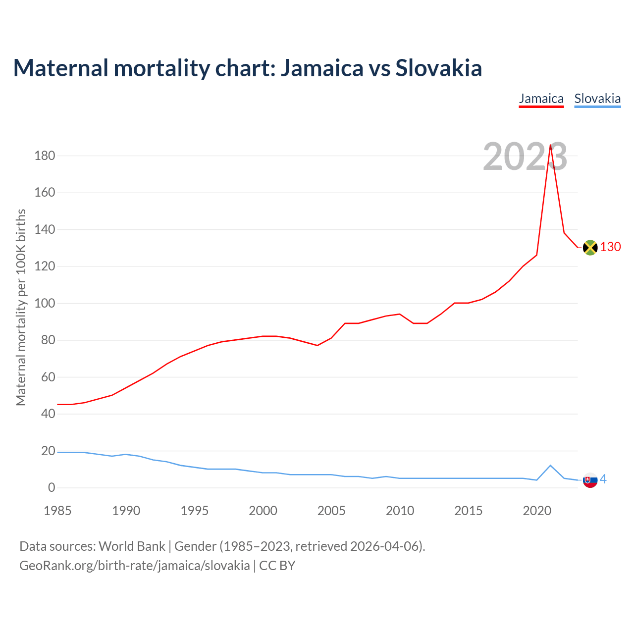The maternal mortality rate, which is the probability of dying during childbirth or within 42 days of pregnancy termination, is 130 deaths per 100,000 live births in Jamaica, compared to 4 deaths in Slovakia.