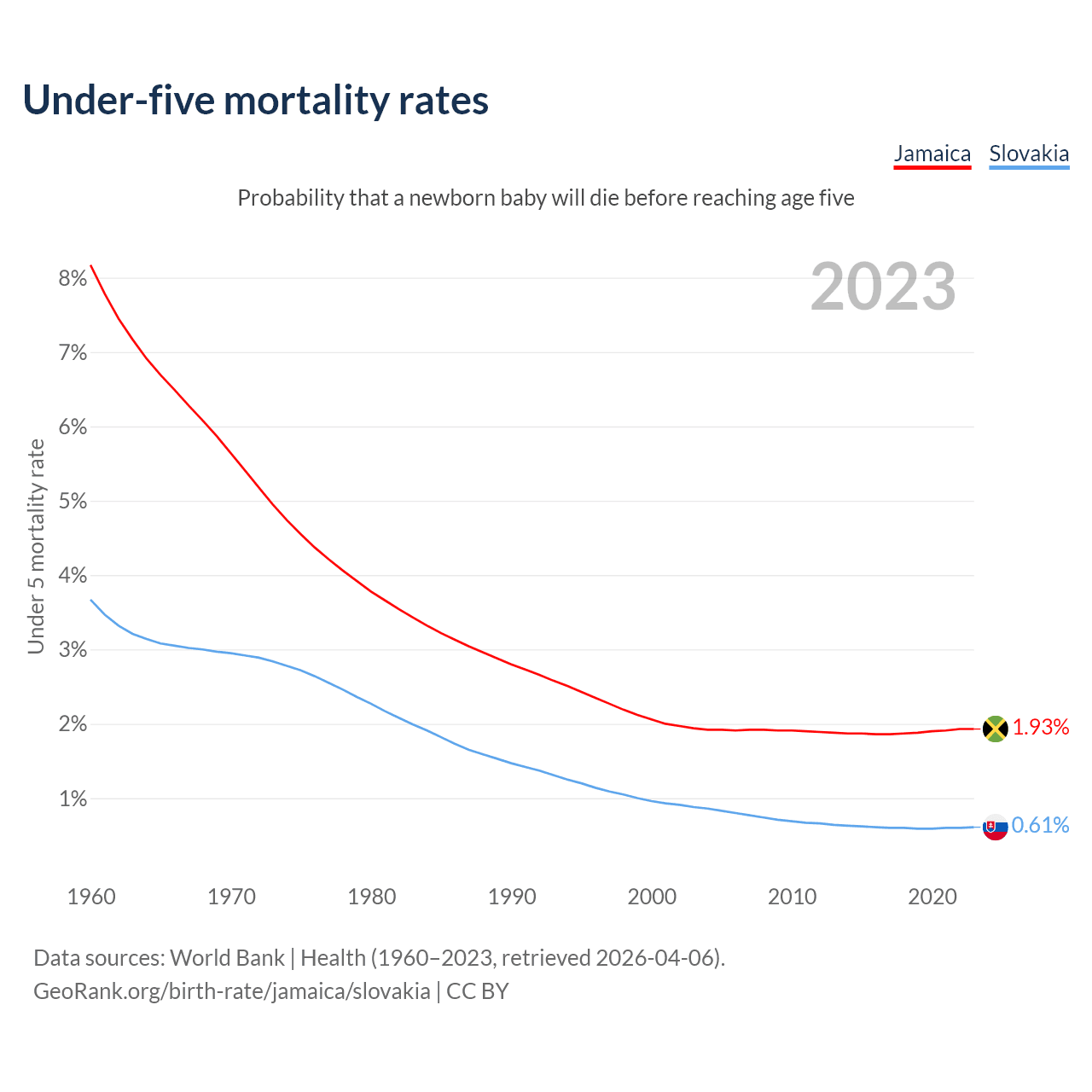 The chance that a newborn baby will die before reaching age five is 1.93% in Jamaica and 0.61% in Slovakia. Above is a chart with historical data on under-five mortality rates.