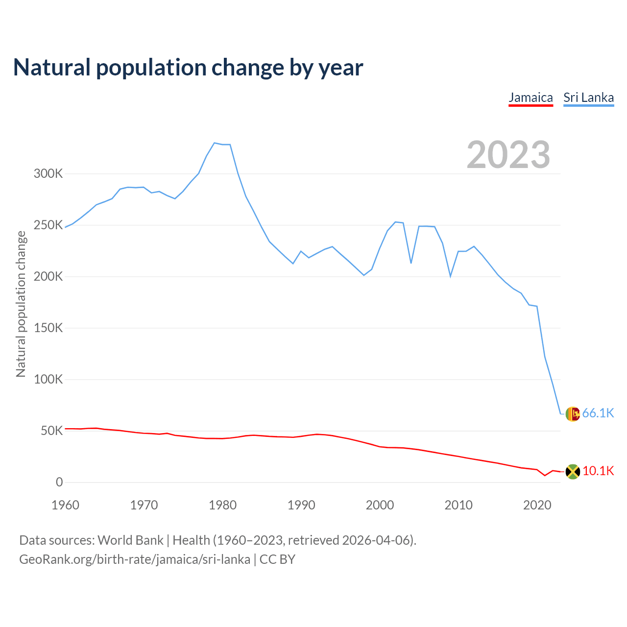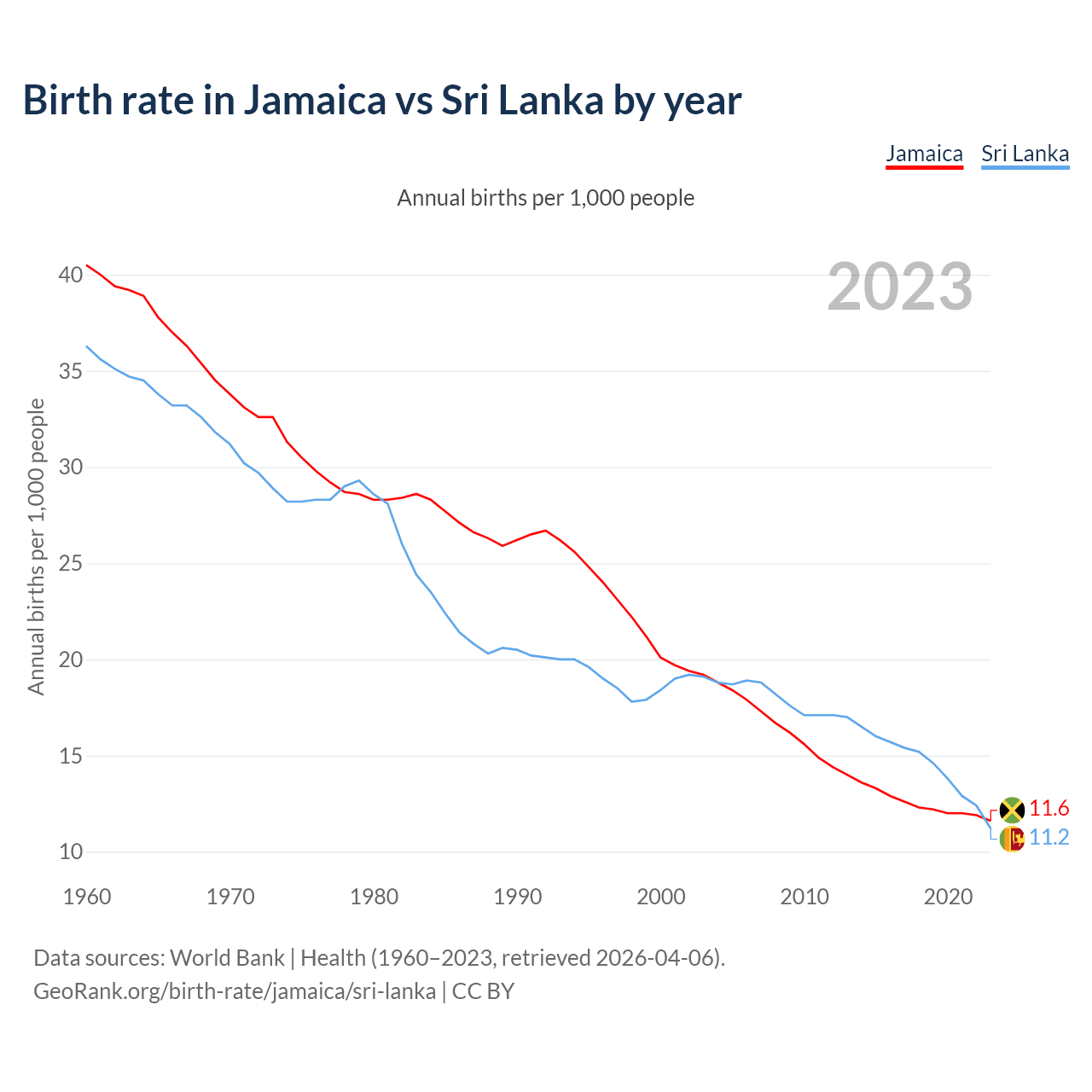 Jamaica has an annual birth rate of 11.6 births per 1,000 people, compared to 11.2 for Sri Lanka. The average number of children a woman is expected to have during her lifetime — the fertility rate, is 1.36 in Jamaica and 1.97 in Sri Lanka — 45.4% difference.