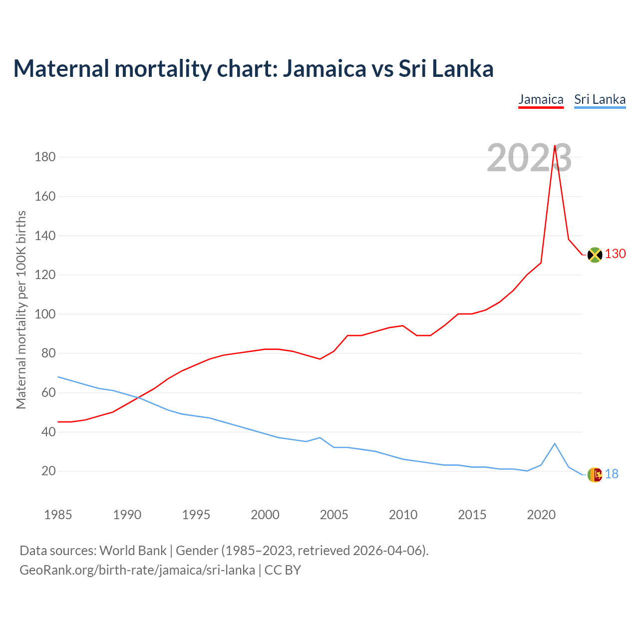 The maternal mortality rate, which is the probability of dying during childbirth or within 42 days of pregnancy termination, is 130 deaths per 100,000 live births in Jamaica, compared to 18 deaths in Sri Lanka.