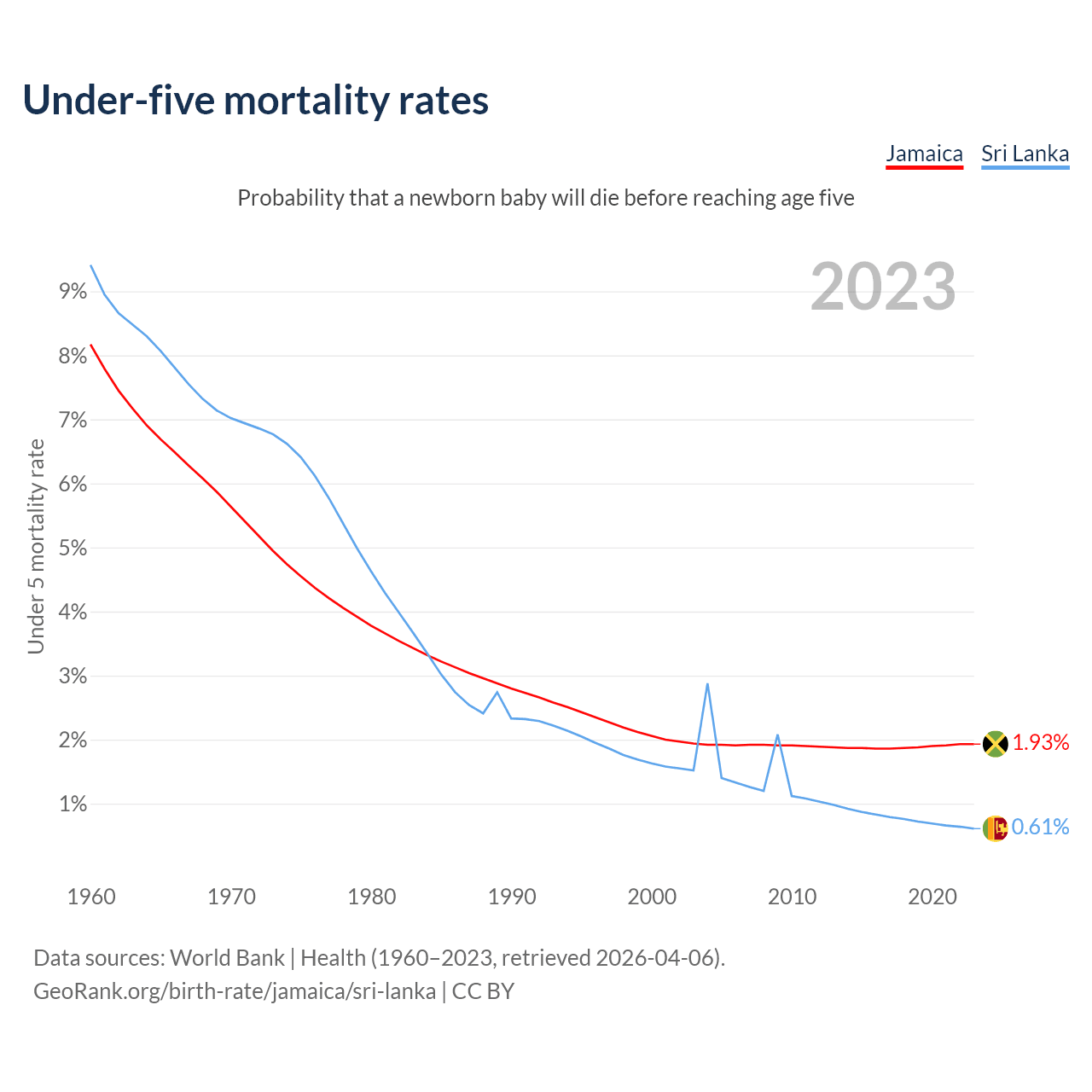 The chance that a newborn baby will die before reaching age five is 1.93% in Jamaica and 0.61% in Sri Lanka. Above is a chart with historical data on under-five mortality rates.