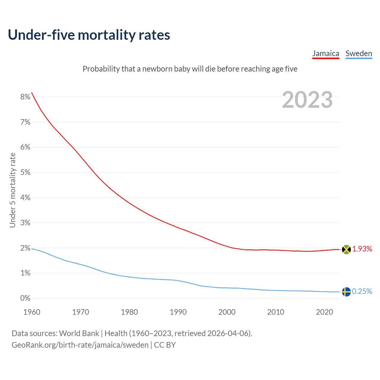 The chance that a newborn baby will die before reaching age five is 1.93% in Jamaica and 0.25% in Sweden. Above is a chart with historical data on under-five mortality rates.