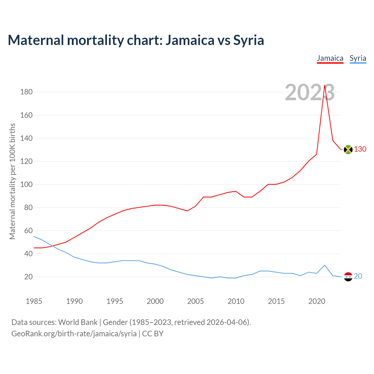 The maternal mortality rate, which is the probability of dying during childbirth or within 42 days of pregnancy termination, is 130 deaths per 100,000 live births in Jamaica, compared to 20 deaths in Syria.