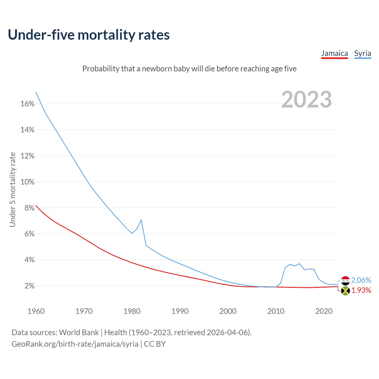 The chance that a newborn baby will die before reaching age five is 1.93% in Jamaica and 2.06% in Syria. Above is a chart with historical data on under-five mortality rates.
