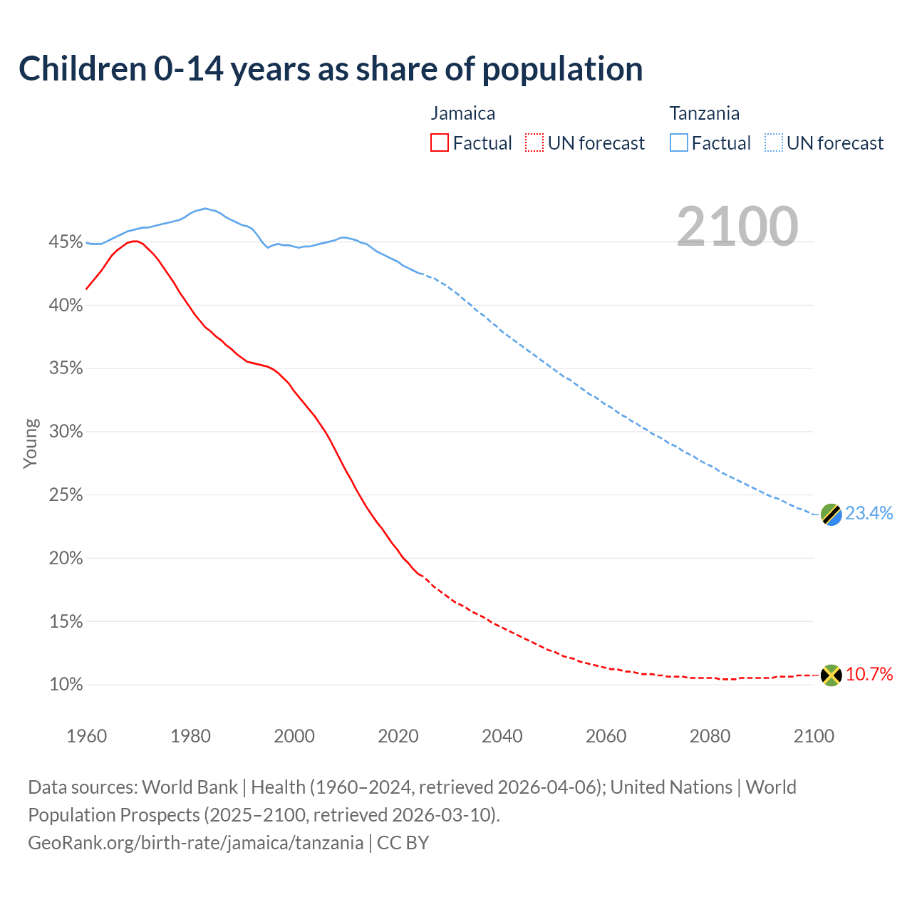 According to the latest available data on birth rates, the fertility rate in Jamaica was 1.36 children per woman in 2023, compared to 4.61 in Tanzania in 2023. The replacement level is considered to be 2.1 children per woman.