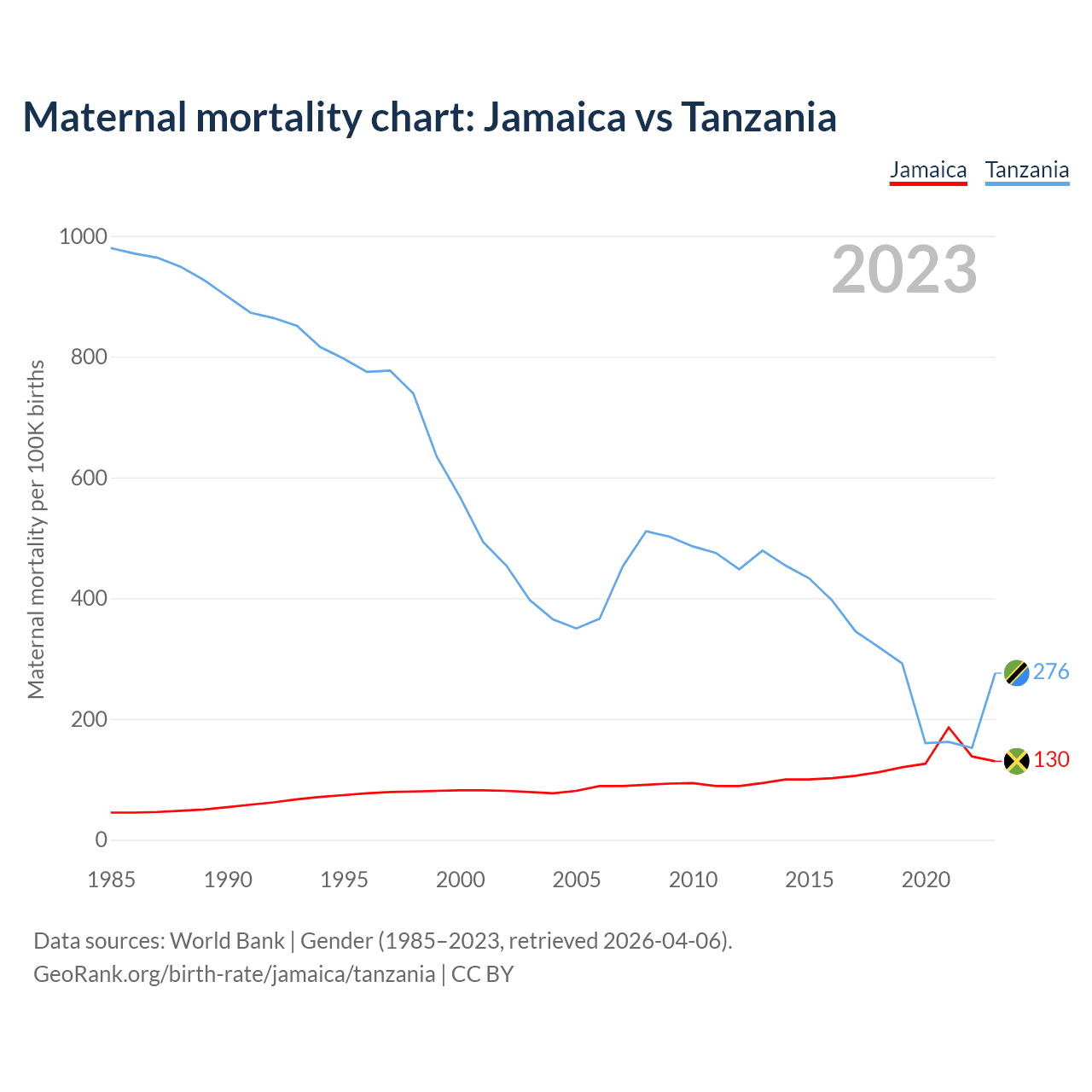 The maternal mortality rate, which is the probability of dying during childbirth or within 42 days of pregnancy termination, is 130 deaths per 100,000 live births in Jamaica, compared to 276 deaths in Tanzania.