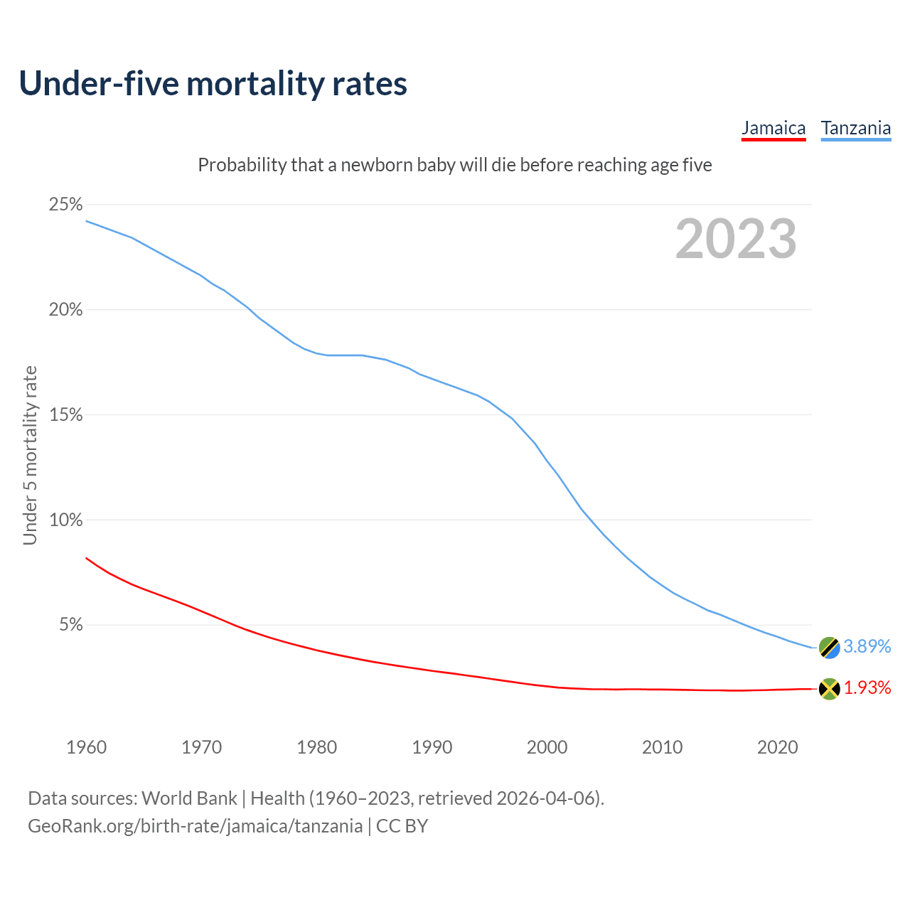 The chance that a newborn baby will die before reaching age five is 1.93% in Jamaica and 3.89% in Tanzania. Above is a chart with historical data on under-five mortality rates.