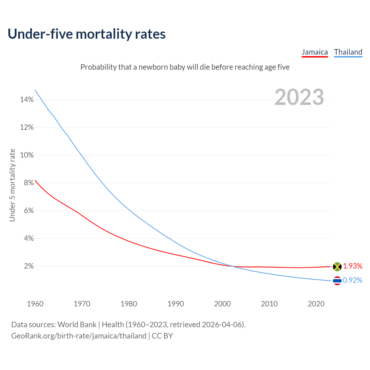 The chance that a newborn baby will die before reaching age five is 1.93% in Jamaica and 0.92% in Thailand. Above is a chart with historical data on under-five mortality rates.
