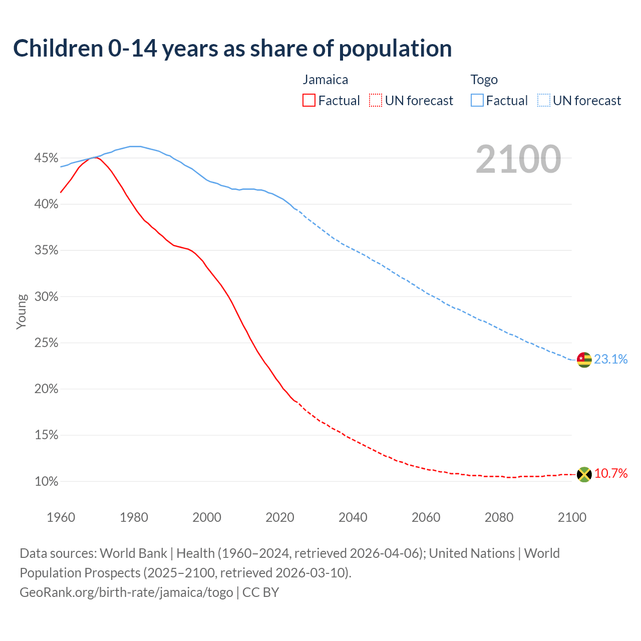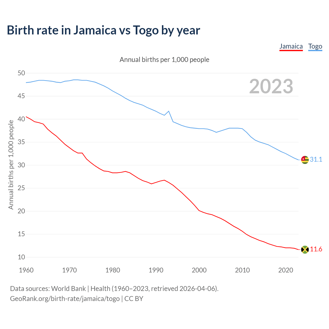 Jamaica has an annual birth rate of 11.6 births per 1,000 people, compared to 31.1 for Togo. The average number of children a woman is expected to have during her lifetime — the fertility rate, is 1.36 in Jamaica and 4.19 in Togo — 208.7% difference.