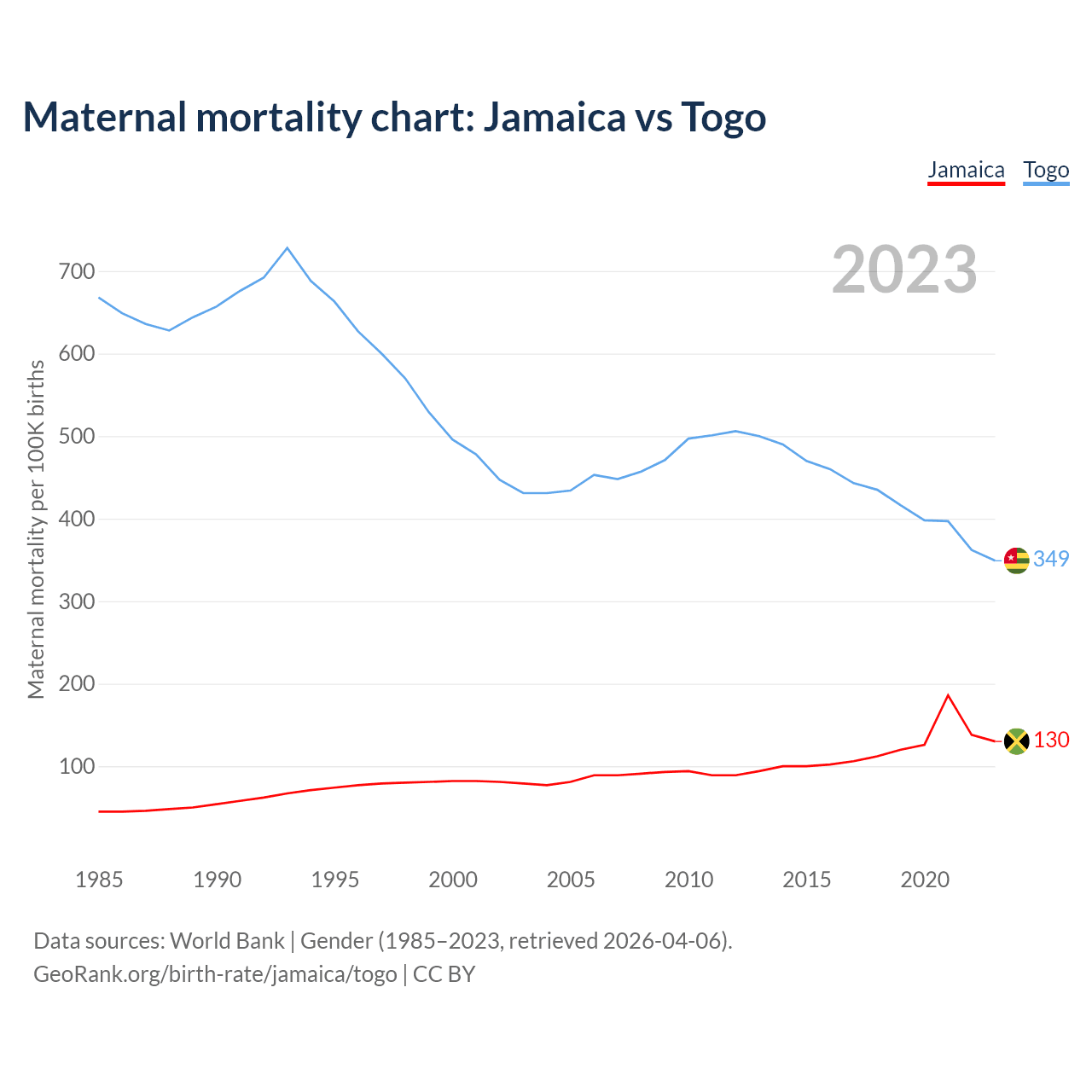 The maternal mortality rate, which is the probability of dying during childbirth or within 42 days of pregnancy termination, is 130 deaths per 100,000 live births in Jamaica, compared to 349 deaths in Togo.