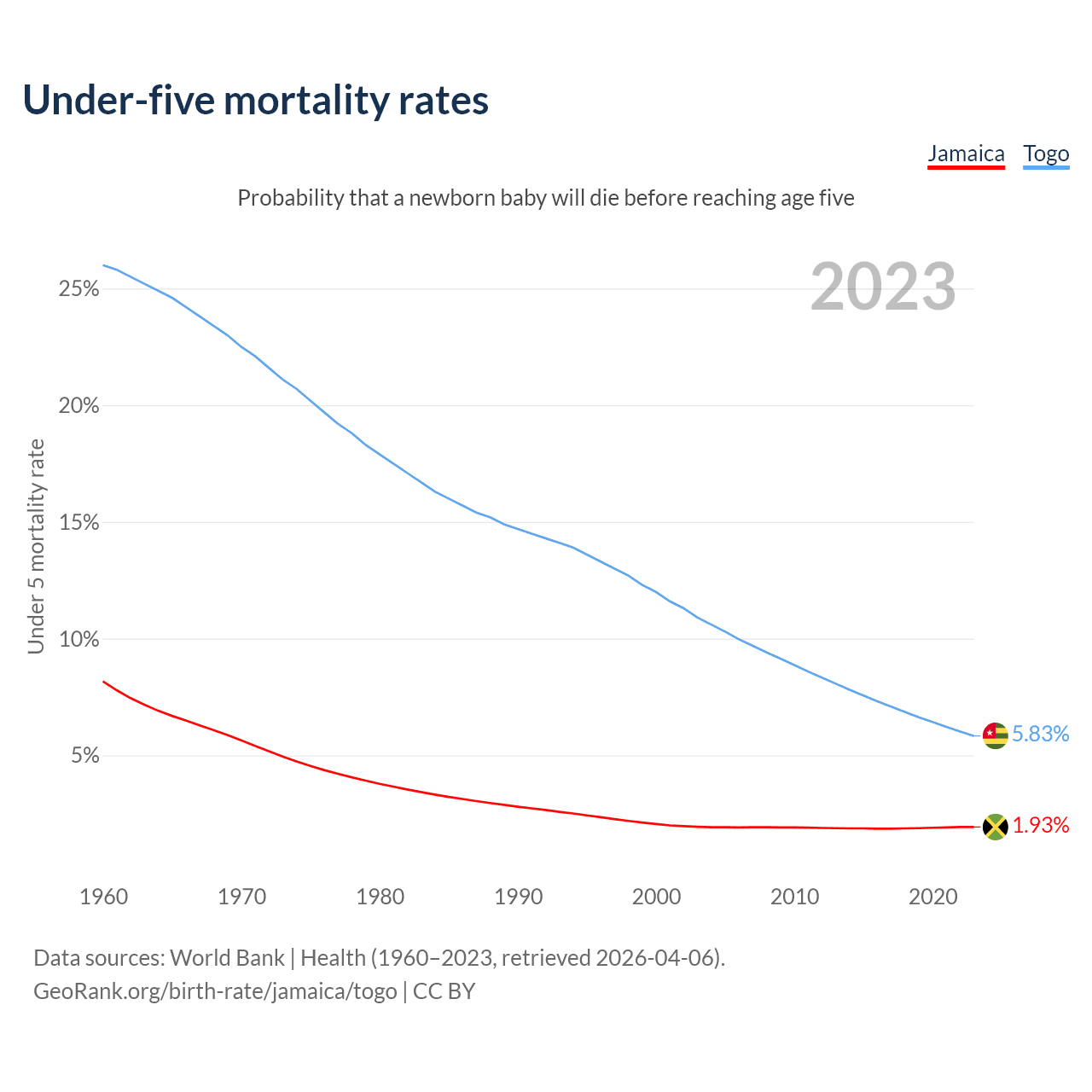The chance that a newborn baby will die before reaching age five is 1.93% in Jamaica and 5.83% in Togo. Above is a chart with historical data on under-five mortality rates.