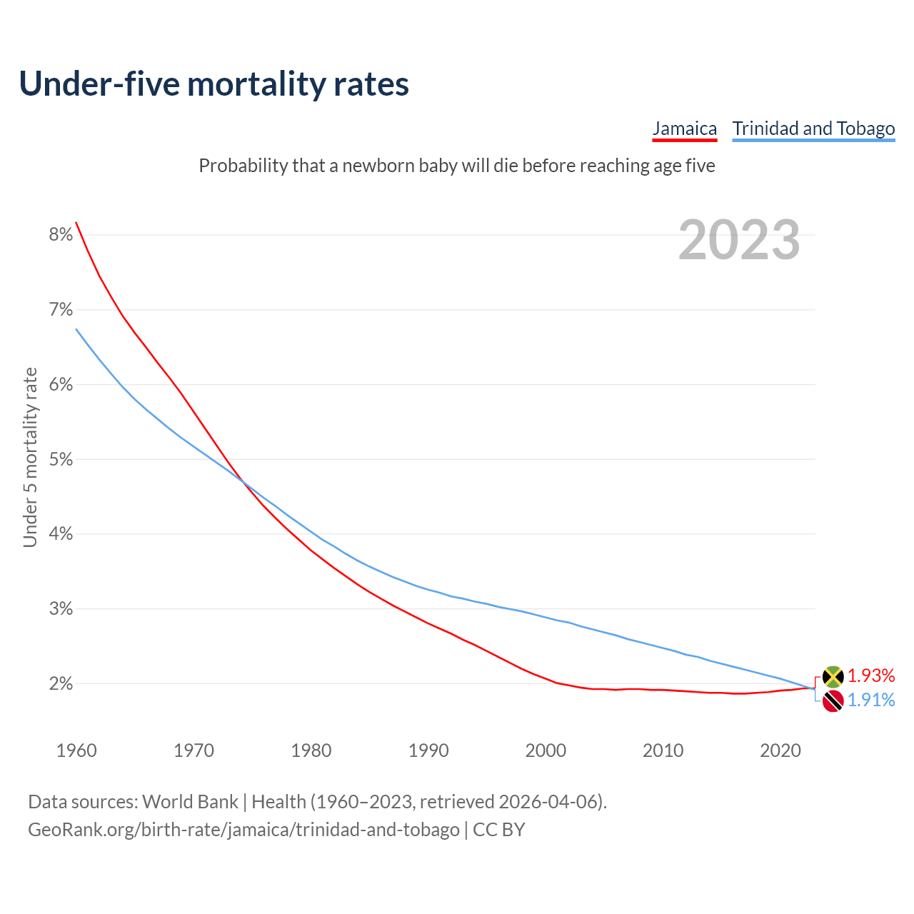 The chance that a newborn baby will die before reaching age five is 1.93% in Jamaica and 1.91% in Trinidad and Tobago. Above is a chart with historical data on under-five mortality rates.
