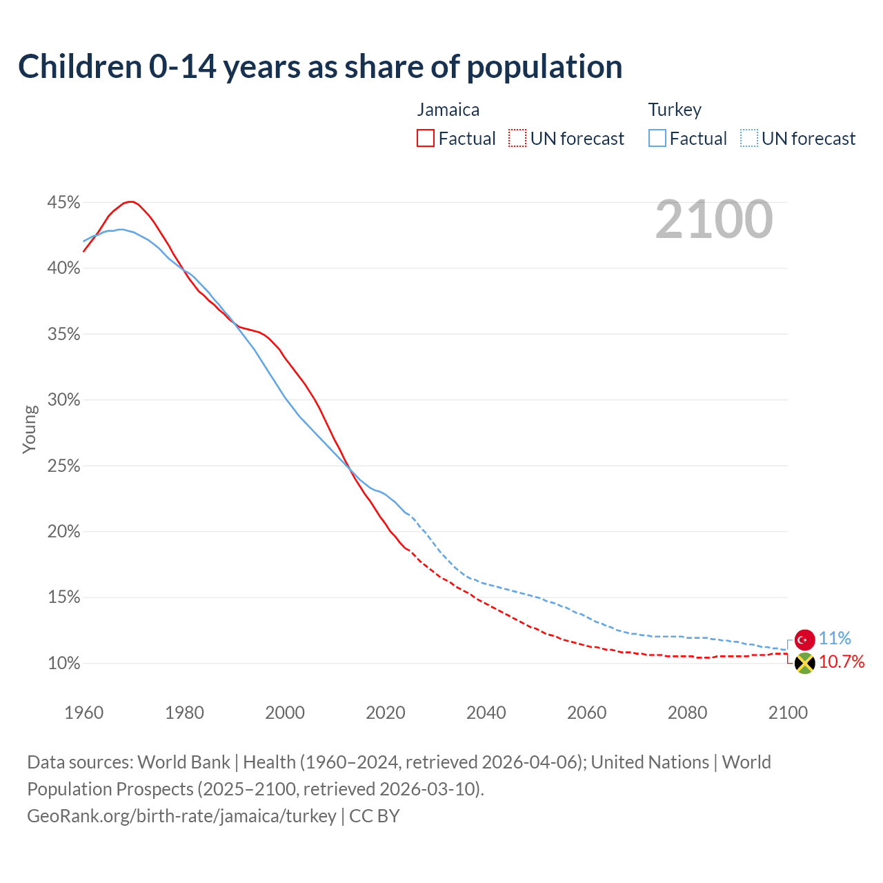 According to the latest available data on birth rates, the fertility rate in Jamaica was 1.36 children per woman in 2023, compared to 1.51 in Turkey in 2023. The replacement level is considered to be 2.1 children per woman.