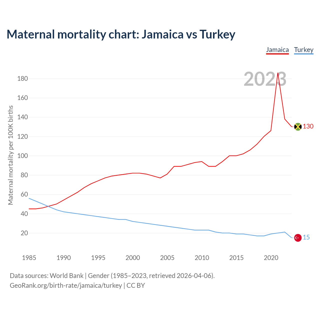 The maternal mortality rate, which is the probability of dying during childbirth or within 42 days of pregnancy termination, is 130 deaths per 100,000 live births in Jamaica, compared to 15 deaths in Turkey.