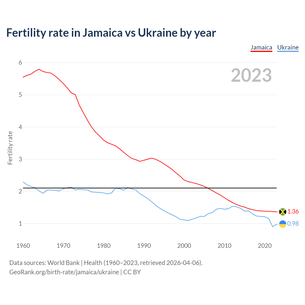 According to the latest available data on birth rates, the fertility rate in Jamaica was 1.36 children per woman in 2023, compared to 0.98 in Ukraine in 2023. The replacement level is considered to be 2.1 children per woman.