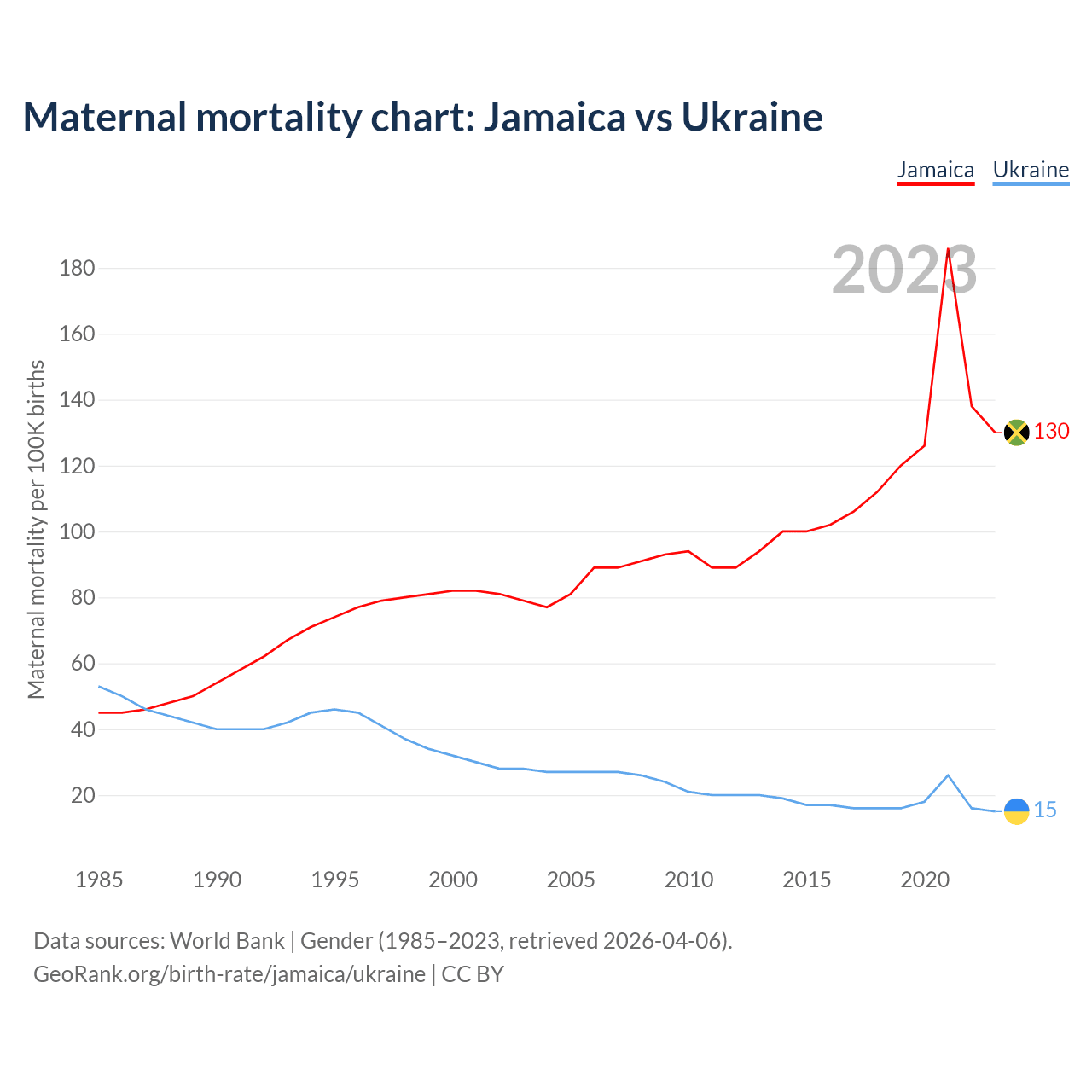The maternal mortality rate, which is the probability of dying during childbirth or within 42 days of pregnancy termination, is 130 deaths per 100,000 live births in Jamaica, compared to 15 deaths in Ukraine.