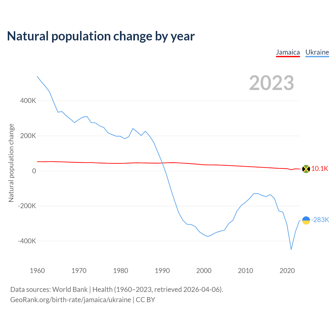 Jamaica has an annual birth rate of 11.6 births per 1,000 people, compared to 5.63 for Ukraine. The average number of children a woman is expected to have during her lifetime — the fertility rate, is 1.36 in Jamaica and 0.98 in Ukraine — 28.1% difference.