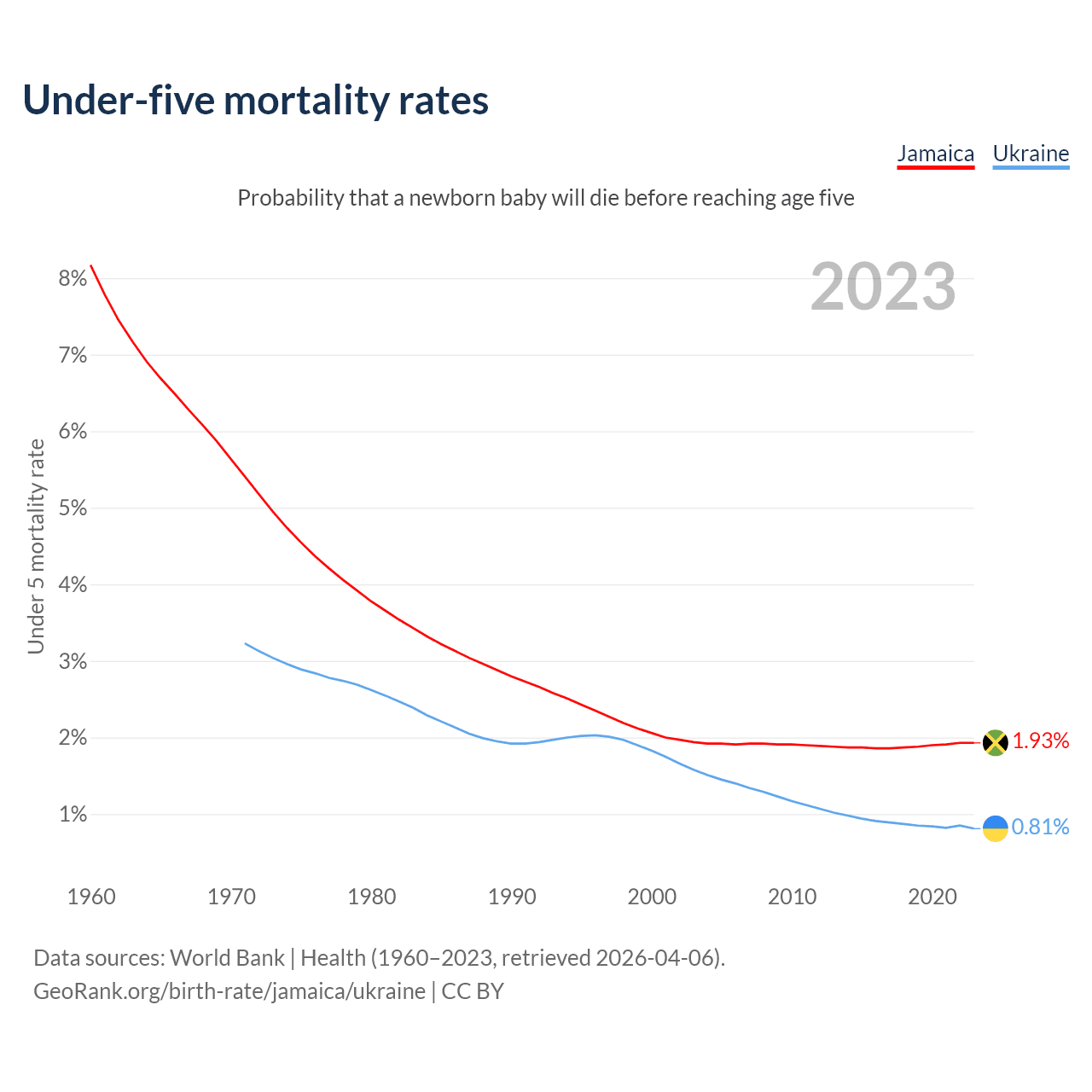 The chance that a newborn baby will die before reaching age five is 1.93% in Jamaica and 0.81% in Ukraine. Above is a chart with historical data on under-five mortality rates.