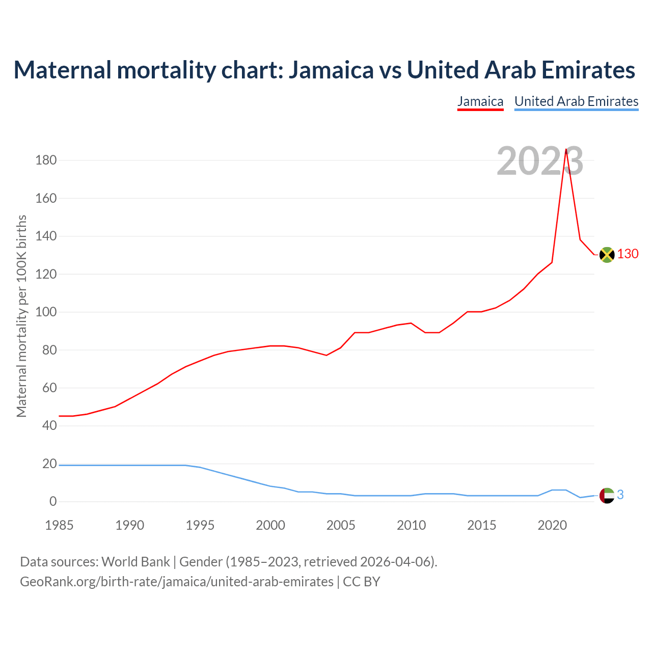 The maternal mortality rate, which is the probability of dying during childbirth or within 42 days of pregnancy termination, is 130 deaths per 100,000 live births in Jamaica, compared to 3 deaths in the United Arab Emirates.