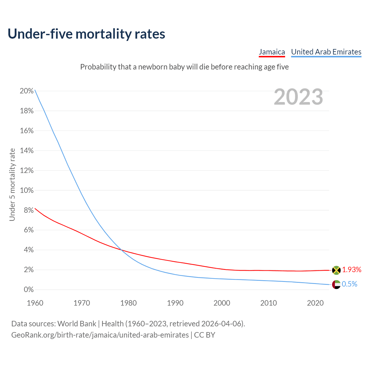 The chance that a newborn baby will die before reaching age five is 1.93% in Jamaica and 0.5% in the United Arab Emirates. Above is a chart with historical data on under-five mortality rates.