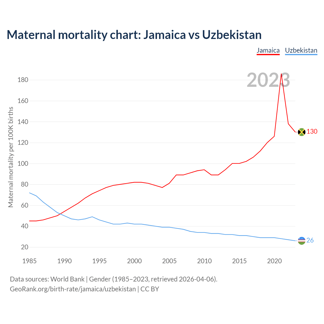 The maternal mortality rate, which is the probability of dying during childbirth or within 42 days of pregnancy termination, is 130 deaths per 100,000 live births in Jamaica, compared to 26 deaths in Uzbekistan.