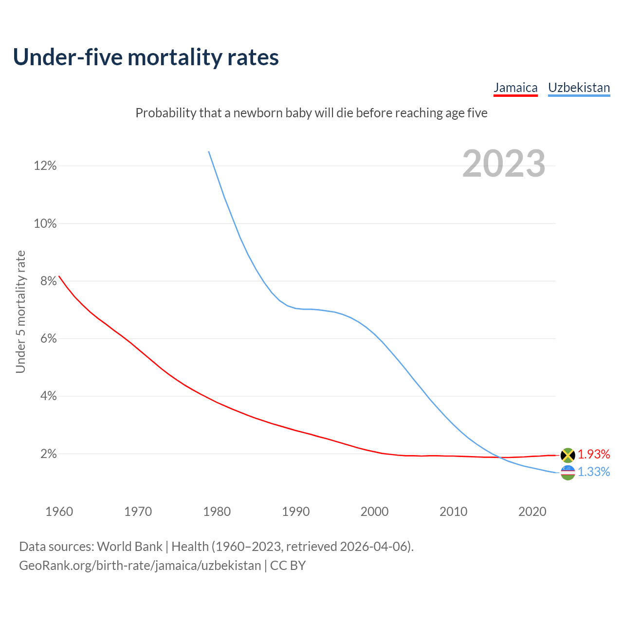 The chance that a newborn baby will die before reaching age five is 1.93% in Jamaica and 1.33% in Uzbekistan. Above is a chart with historical data on under-five mortality rates.