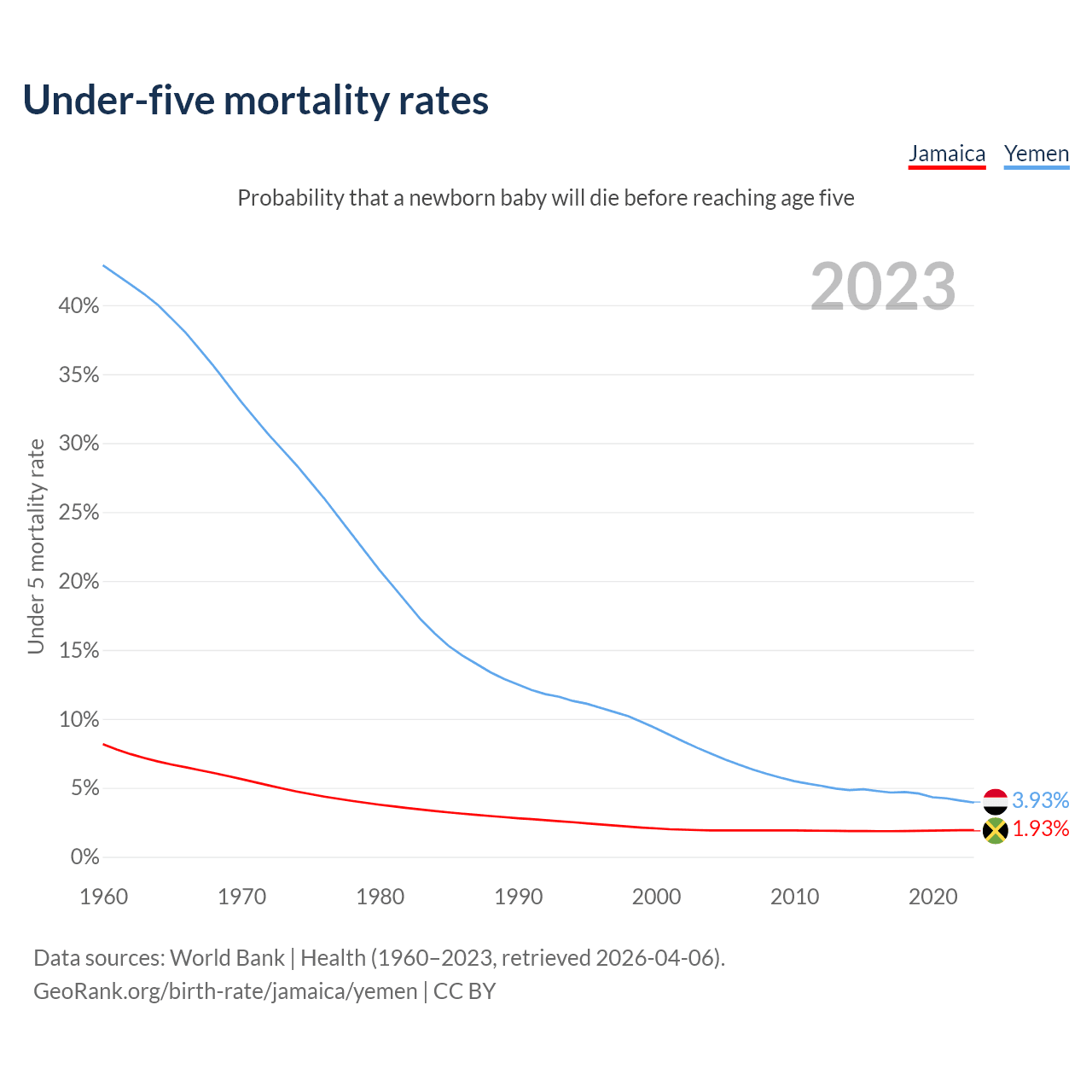 The chance that a newborn baby will die before reaching age five is 1.93% in Jamaica and 3.93% in Yemen. Above is a chart with historical data on under-five mortality rates.