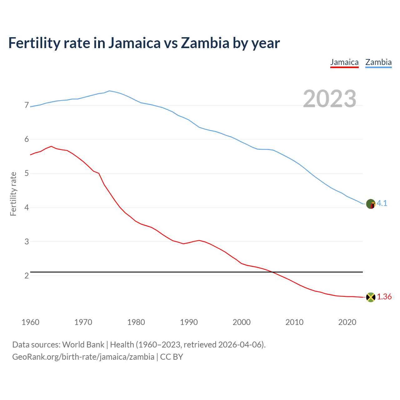 1960 vs 2023, the fertility rate has decreased by 75.5% in Jamaica and by 41% in Zambia — in 1960, it was 5.54 and 6.95, respectively.