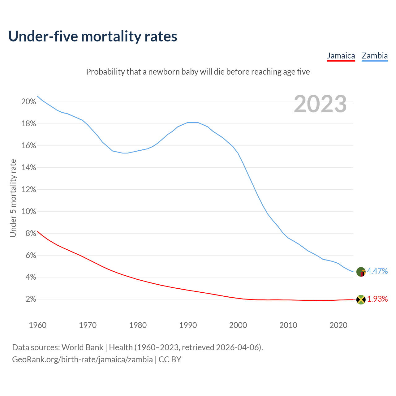 The chance that a newborn baby will die before reaching age five is 1.93% in Jamaica and 4.47% in Zambia. Above is a chart with historical data on under-five mortality rates.