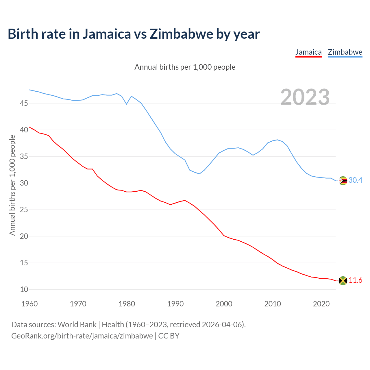Jamaica has an annual birth rate of 11.6 births per 1,000 people, compared to 30.4 for Zimbabwe. The average number of children a woman is expected to have during her lifetime — the fertility rate, is 1.36 in Jamaica and 3.72 in Zimbabwe — 174.2% difference.