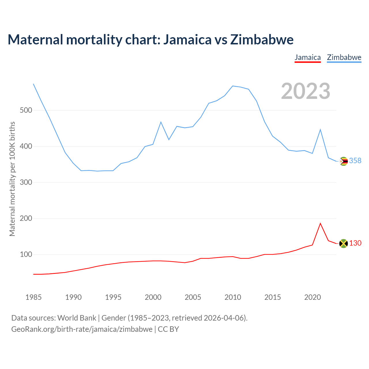 The maternal mortality rate, which is the probability of dying during childbirth or within 42 days of pregnancy termination, is 130 deaths per 100,000 live births in Jamaica, compared to 358 deaths in Zimbabwe.