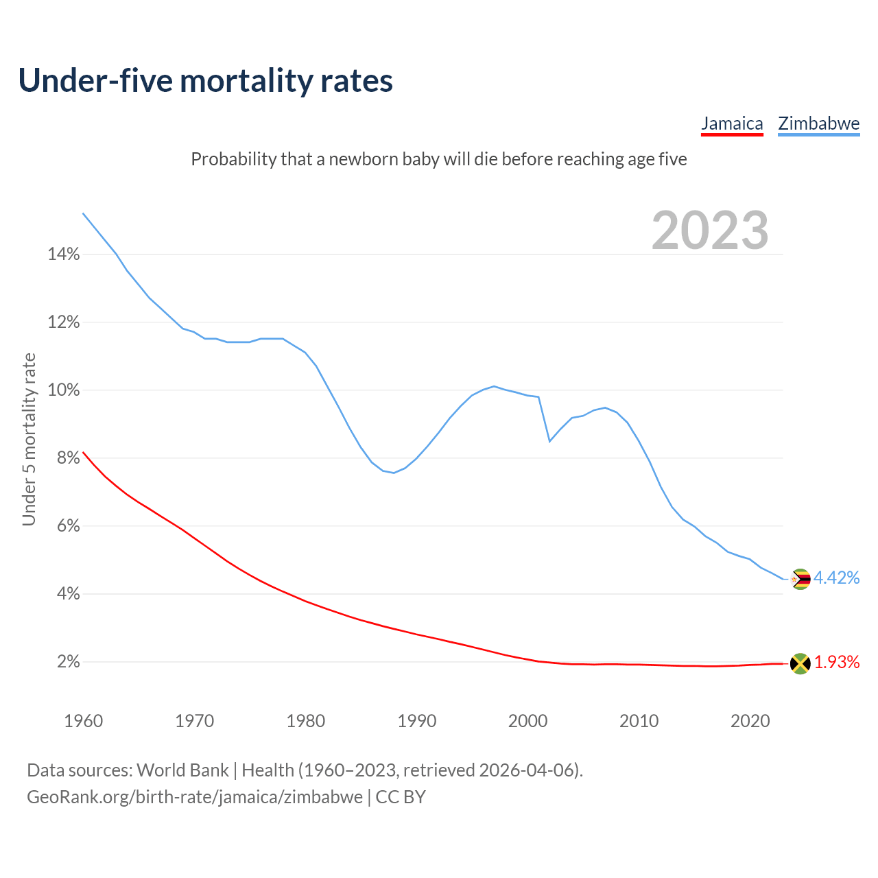 The chance that a newborn baby will die before reaching age five is 1.93% in Jamaica and 4.42% in Zimbabwe. Above is a chart with historical data on under-five mortality rates.