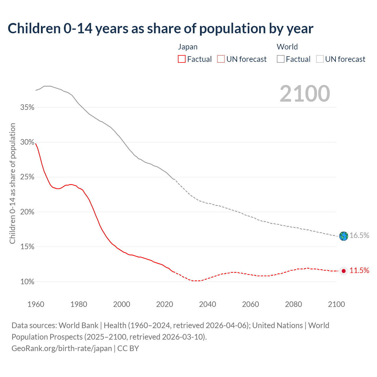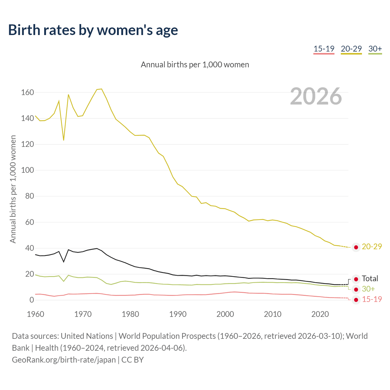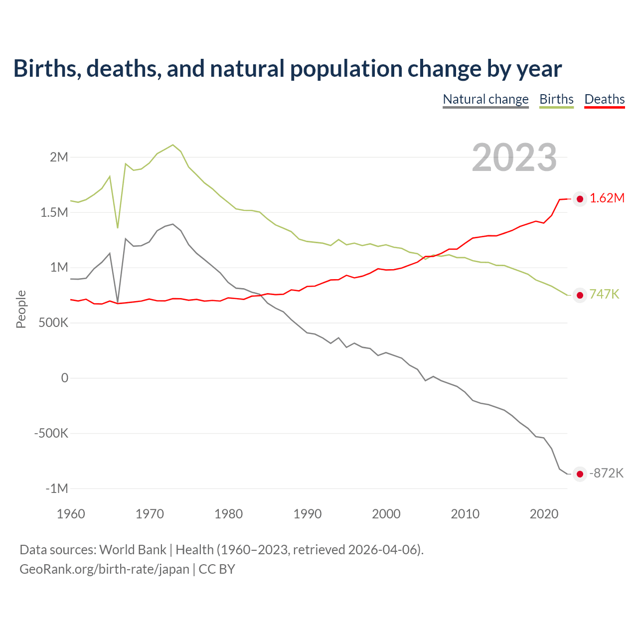 Japan has a birth rate of 6 (annual births per 1,000 people) and a fertility rate of 1.2 (the average number of children a woman is expected to have over her lifetime based on current age-specific birth rates).