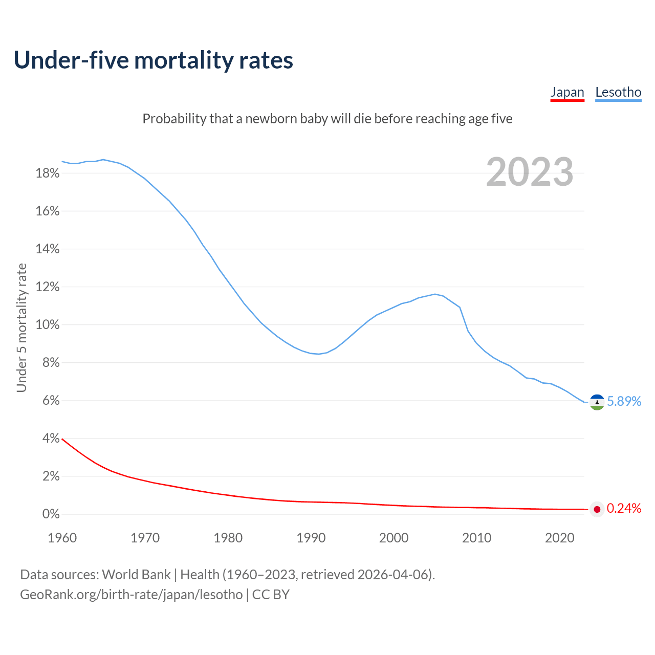 The chance that a newborn baby will die before reaching age five is 0.24% in Japan and 5.89% in Lesotho. Above is a chart with historical data on under-five mortality rates.