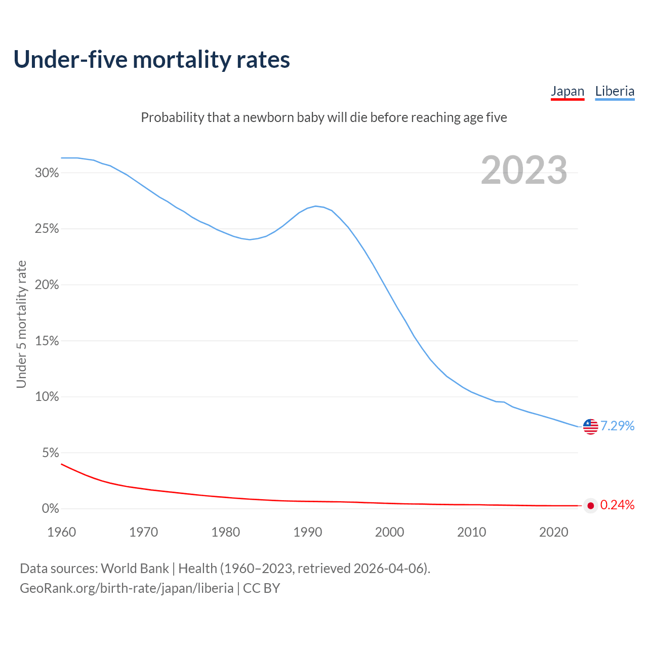 The chance that a newborn baby will die before reaching age five is 0.24% in Japan and 7.29% in Liberia. Above is a chart with historical data on under-five mortality rates.