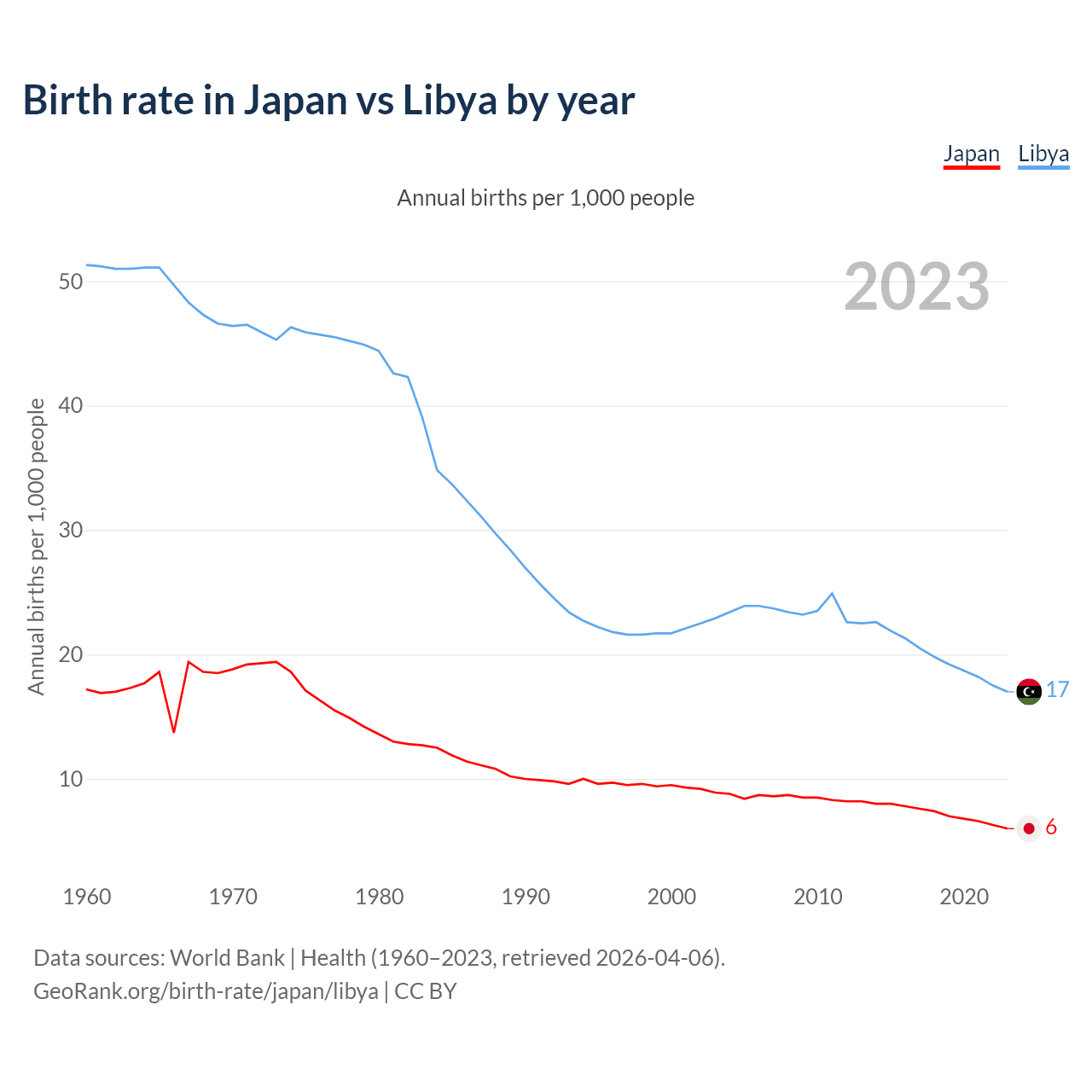 Japan has an annual birth rate of 6 births per 1,000 people, compared to 17 for Libya. The average number of children a woman is expected to have during her lifetime — the fertility rate, is 1.2 in Japan and 2.36 in Libya — 96.3% difference.