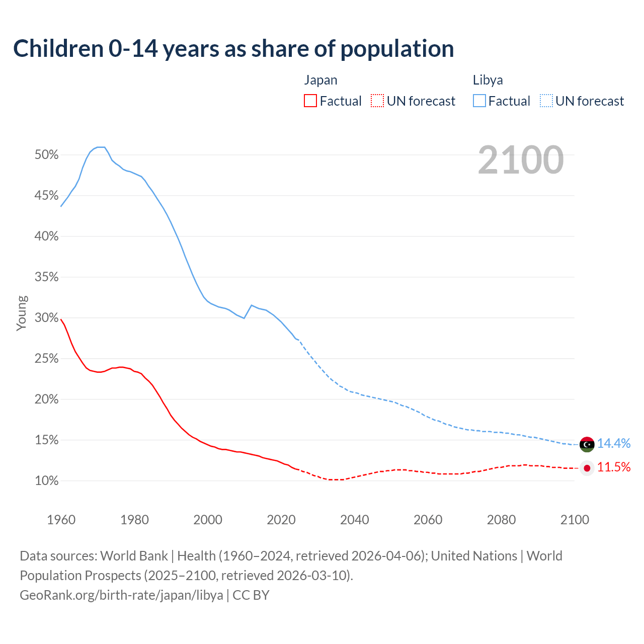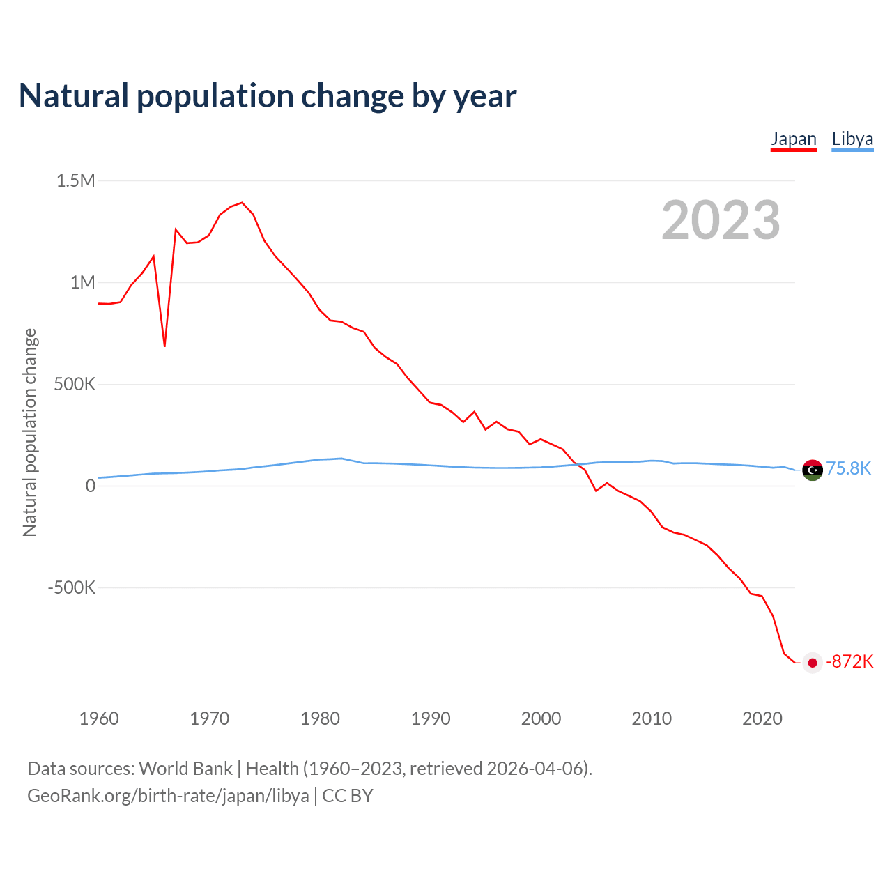 According to the latest available data on birth rates, the fertility rate in Japan was 1.2 children per woman in 2023, compared to 2.36 in Libya in 2023. The replacement level is considered to be 2.1 children per woman.
