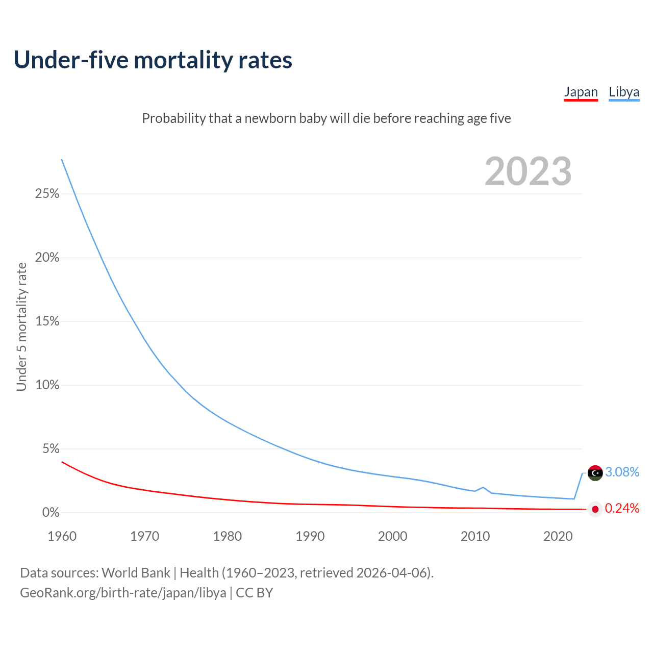 The chance that a newborn baby will die before reaching age five is 0.24% in Japan and 3.08% in Libya. Above is a chart with historical data on under-five mortality rates.